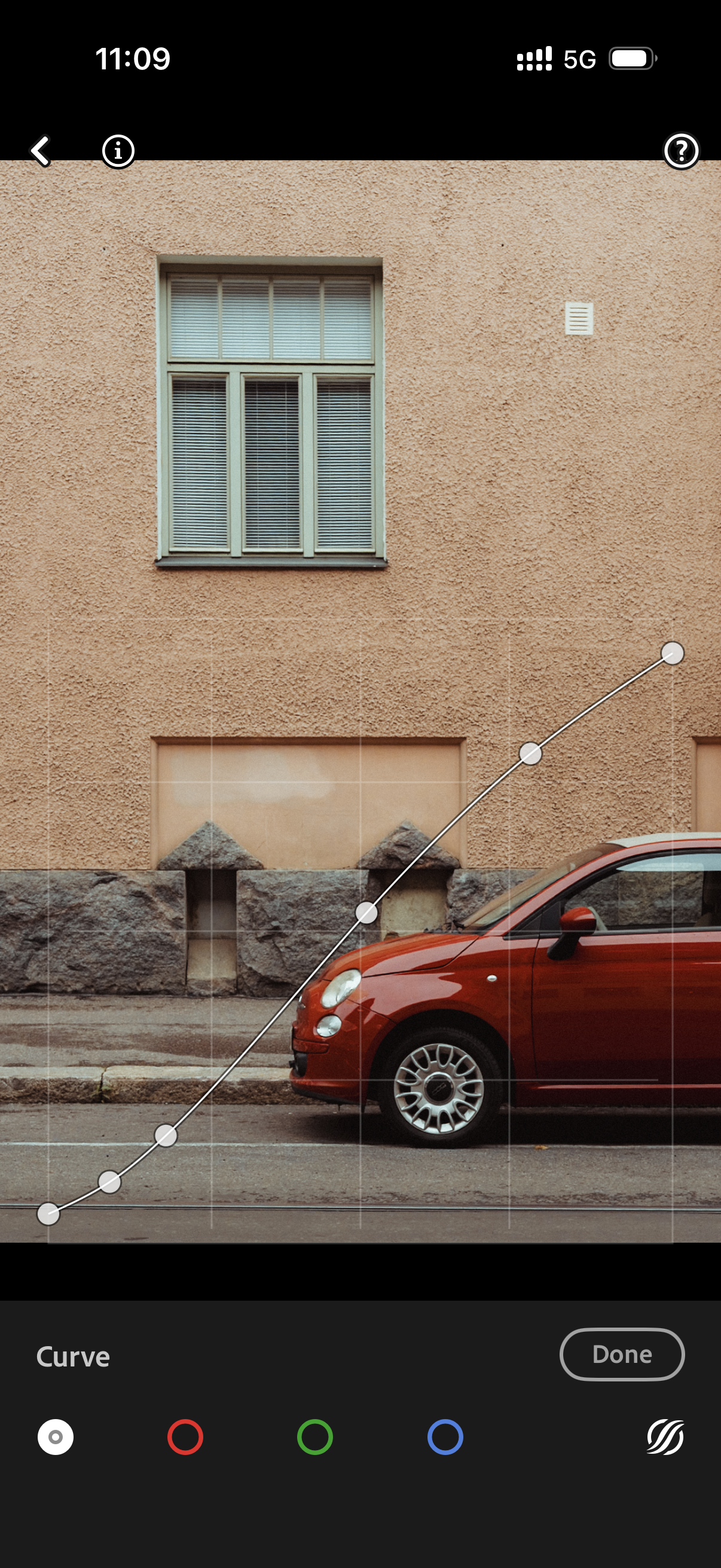 In Curves, fade the whites and blacks slightly. Add points at around 25% and 75% on the line, then gently lift the black point and drop the white point. This removes pure black and white pixels, giving a softer, more film-like look.