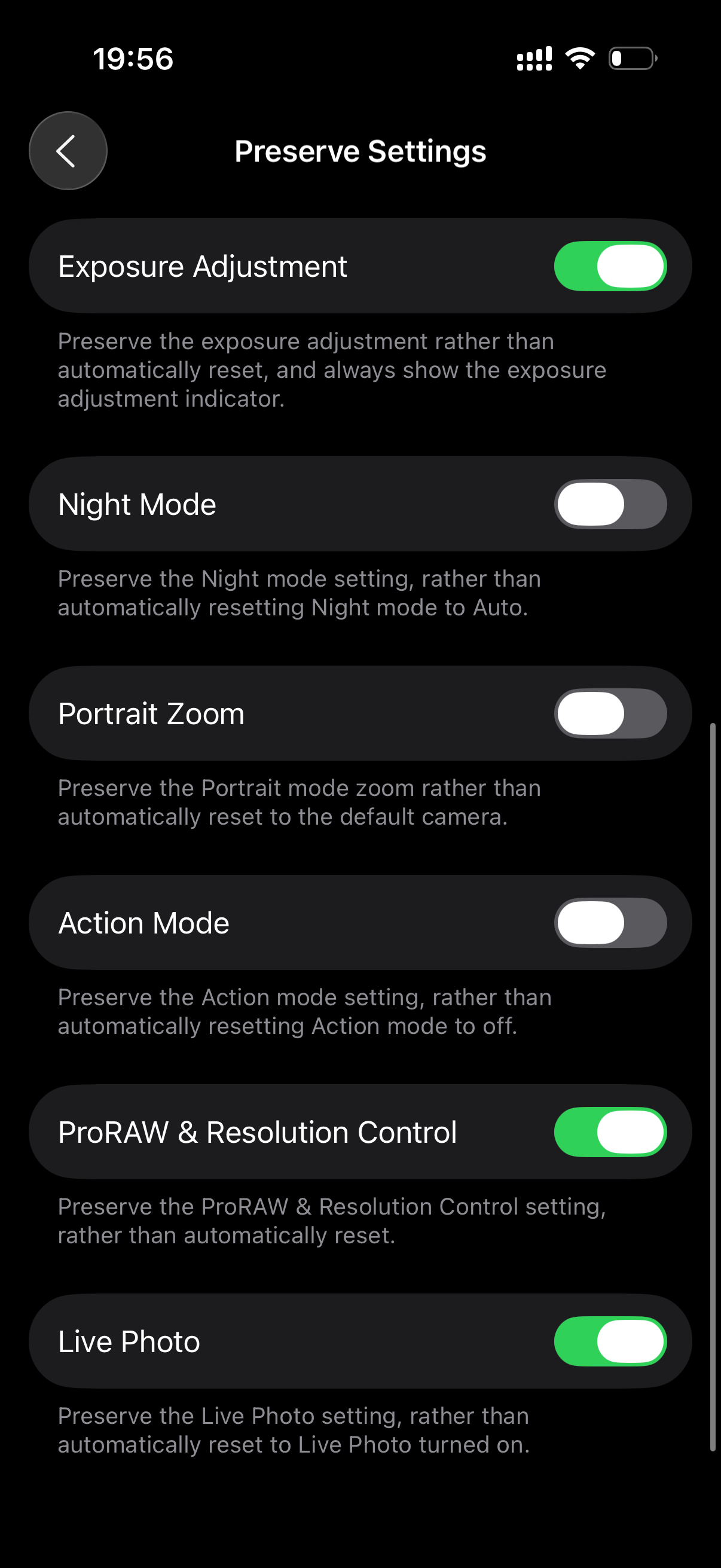 Preserve Settings – This section allows you to select which settings are remembered when you quit and restart the Camera app. I only enable Macro Mode, Exposure Adjustment, ProRAW, and Live Photo. Whatever changes I make to these will be remembered, all other parameters will reset to default.